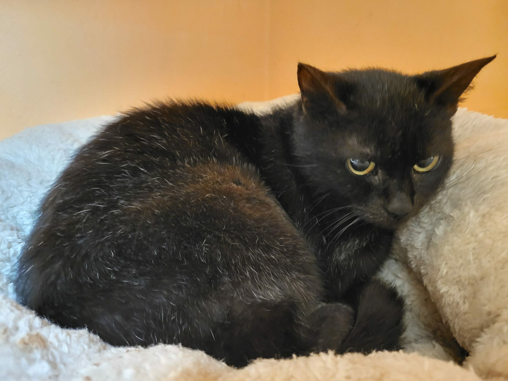 Kajda má poškozené plíce a nemocné očičko, které stále slzí. Kajdička slyšitelně těžce dýchá, chrčí, chroptí, chrápe. Ani Ventolin, antibiotika nebo posilující kúry a nakopávače imunity jí nepřinesly úlevu. Dnes je z ní trvale nemocná kočička. Dýchání ji vyčerpává, nožky se jí často motají :(