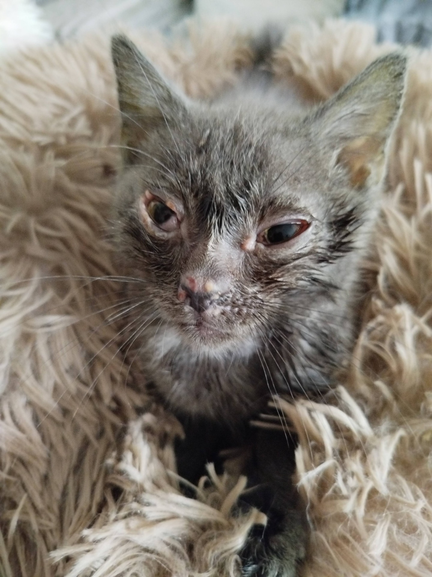 Šédíčka nemoci skolily tak, že byl několikrát na hraně života a smrti. Nic nepomáhalo, šestery antibiotika, veškeré možné nakopávače imunity... až nedávno jsme se dostali k lékům, které u nás nejsou běžně dostupné a musí se pracně shánět v zahraničí. Jsou velmi drahé, ale zároveň jsou jedinými léky, které zabírají. Malý Šéďa začal znovu vidět, opustily ho horečky, začal přibírat na váze, je hravý, veselý a živý. Stav na fotce je už stav po výrazném zlepšení, tak si umíte asi představit, jak na tom byl. Šéďu čeká ještě dlouhá léčba.